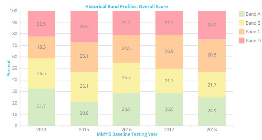 The MidYIS Band Graphs show the proportion of pupils falling into each of the four performance bands year on year. This gives schools the ability to: