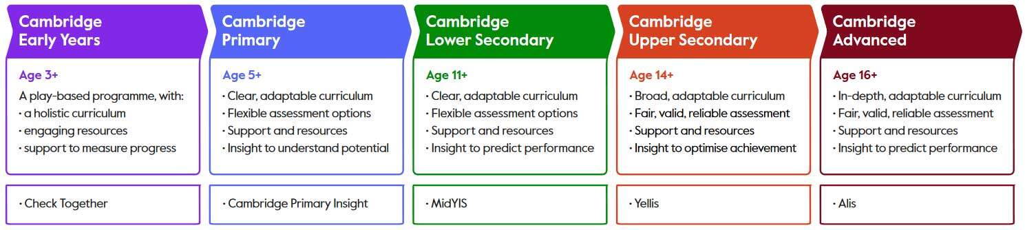 The Cambridge Checkpoint tests are used at the end of the Primary or Lower Secondary programmes. Cambridge Checkpoint is an assessment of performance while also giving learners the experience of taking an external assessment, as the test is marked by Cambridge. Cambridge Checkpoint and Progression Tests provide a rigorous, standardised performance analysis of individual primary and lower secondary learners. Cambridge Progression Tests are internal assessments designed for use in the classroom and cover English as a first or second language, maths and science.
