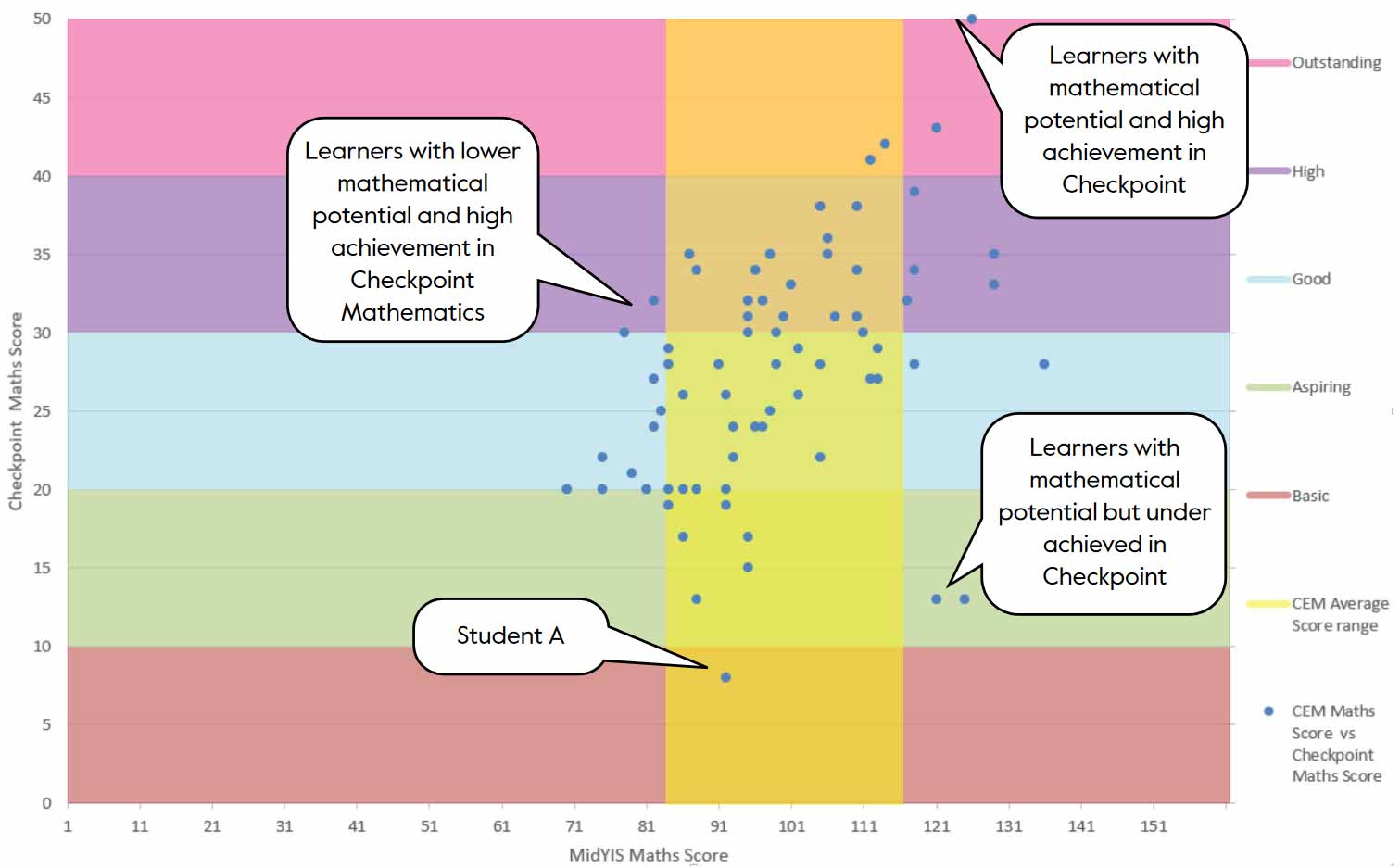 As these are snapshot assessments, further investigation is needed as to why student A looks like they have underperformed in their Checkpoint Mathematics assessment as there are many factors that can affect a student’s performance on the day that they take an assessment.